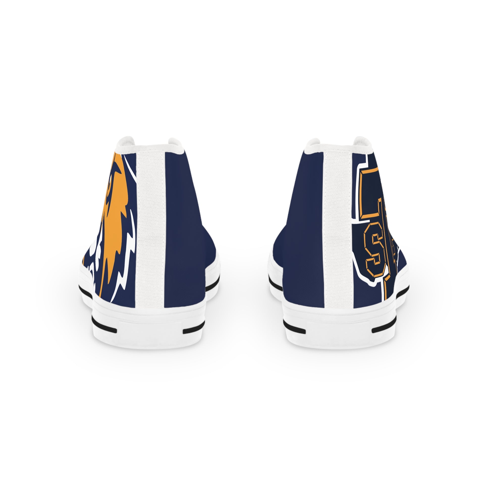 These high-top sneakers bring classic varsity energy to your everyday look. The deep navy canvas is wrapped in a full-print design that spots bold gold accents and a stitched-letter emblem at the heel, giving a subtle nod to collegiate style. They feel cushioned underfoot thanks to EVA memory foam insoles and a shock-absorbing EVA midsole, while the pleather toe cap and durable rubber outsole stand up to daily wear. Silver metal eyelets and clean white laces keep the silhouette crisp. Wear them on campus, at weekend meetups, or anywhere you want a sporty, confident finish to your outfit.